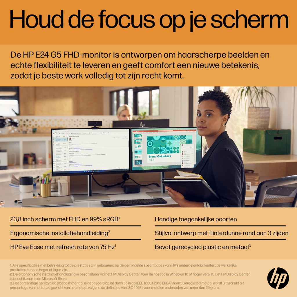 De HP E24 G5 FHD Monitor is met opzet vervaardigd voor haarfijne beelden, persoonlijk comfort en echte flexibiliteit, en geeft een nieuwe invulling aan het begrip comfort. Er staat je dus niets meer in de weg om optimaal te presteren. Dit beeldscherm is stijlvol ontworpen met oog voor het milieu en is perfect voor thuis en op kantoor.
